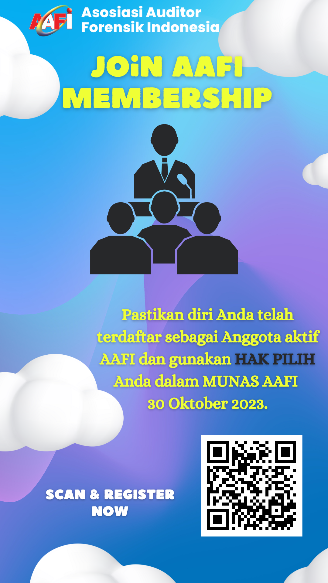 Asosiasi Forensik Auditor Indonesia (AAFI YOGOSEM) mengundang Bapak/Ibu Anggota Aktif AAFI YOGOSEM untuk melakukan pendaftaran Musyawarah Nasional (MUNAS) AAFI YOGOSEM yang direncanakan akan dilaksanakan pada 30 Oktober 2023. Silakan melakukan pendaftaran di website AAFI YOGOSEM dengan alamat www.aafiyogosem.org/2023. Jangan lupa siapkan Sertifikat Certified Forensic Auditor (CFrA) dan Bukti Iuran Tahunan AAFI YOGOSEM saat pendaftaran.