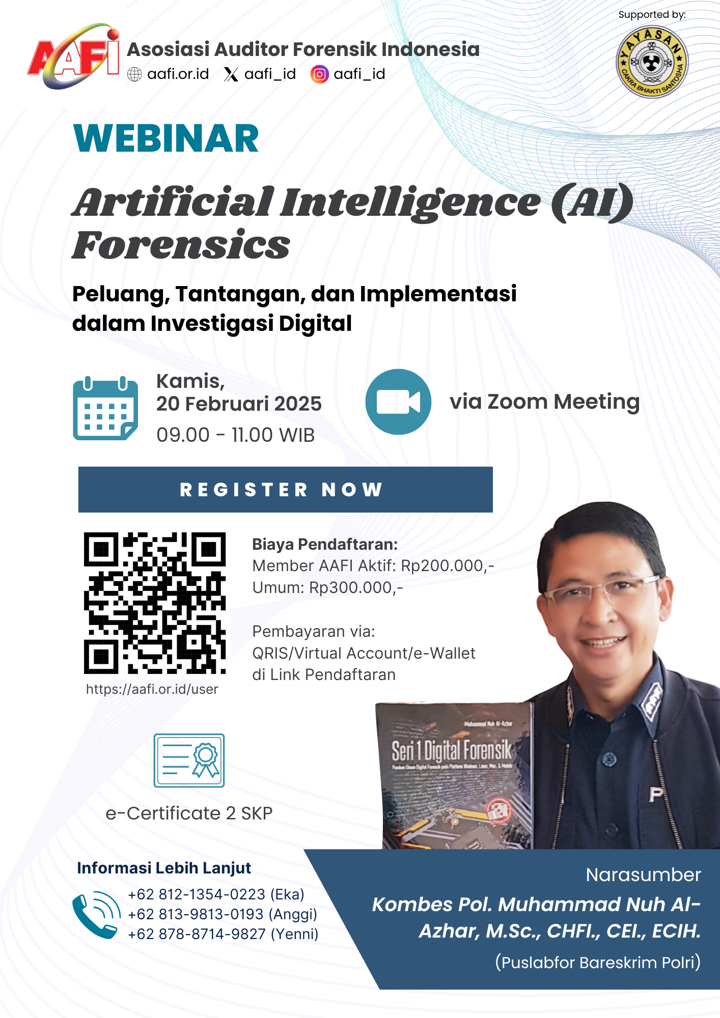 Untuk menjawab pertanyaan-pertanyaan ini, Asosiasi Auditor Forensik Indonesia Yogosem (AAFI YOGOSEM), dengan dukungan dari Yayasan Cakra Bhakti Santosha, mengadakan webinar bertema "Artificial Intelligence (AI) Forensics".
