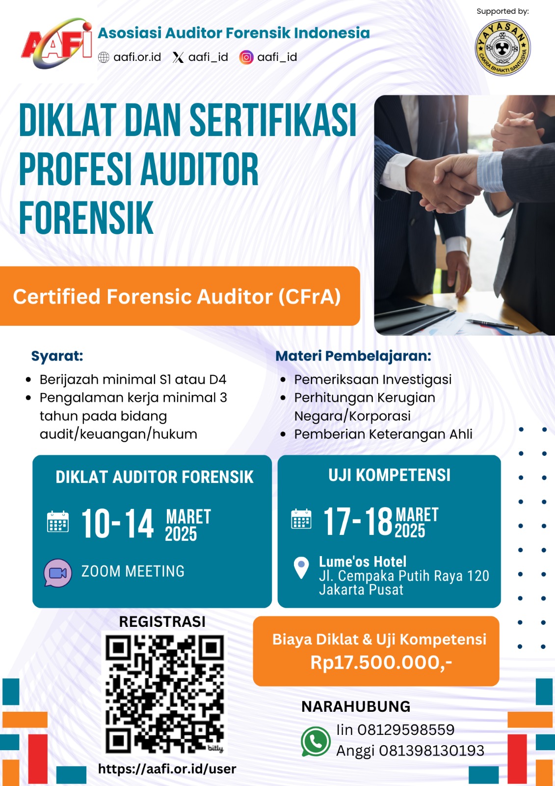 Asosiasi Auditor Forensik Indonesia Yogosem (AAFI YOGOSEM), dengan dukungan dari Yayasan Cakra Bhakti Santosha, kembali mengadakan Diklat dan Sertifikasi Profesi Auditor Forensik dengan gelar Certified Forensic Auditor (CFrA). Program ini bertujuan untuk meningkatkan kompetensi para auditor dalam bidang audit investigatif dan forensik guna mendukung upaya pemberantasan tindak pidana keuangan dan korupsi.